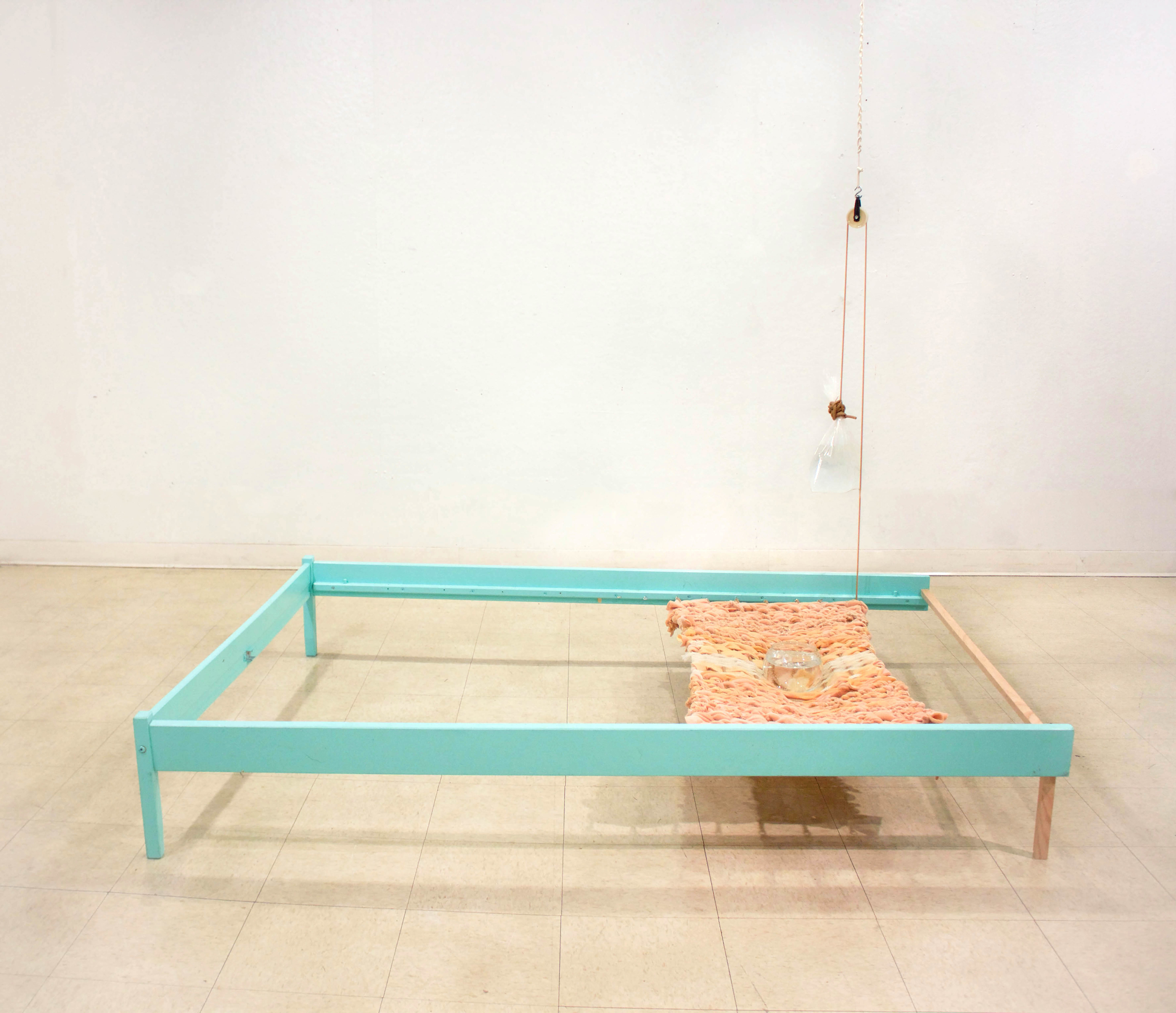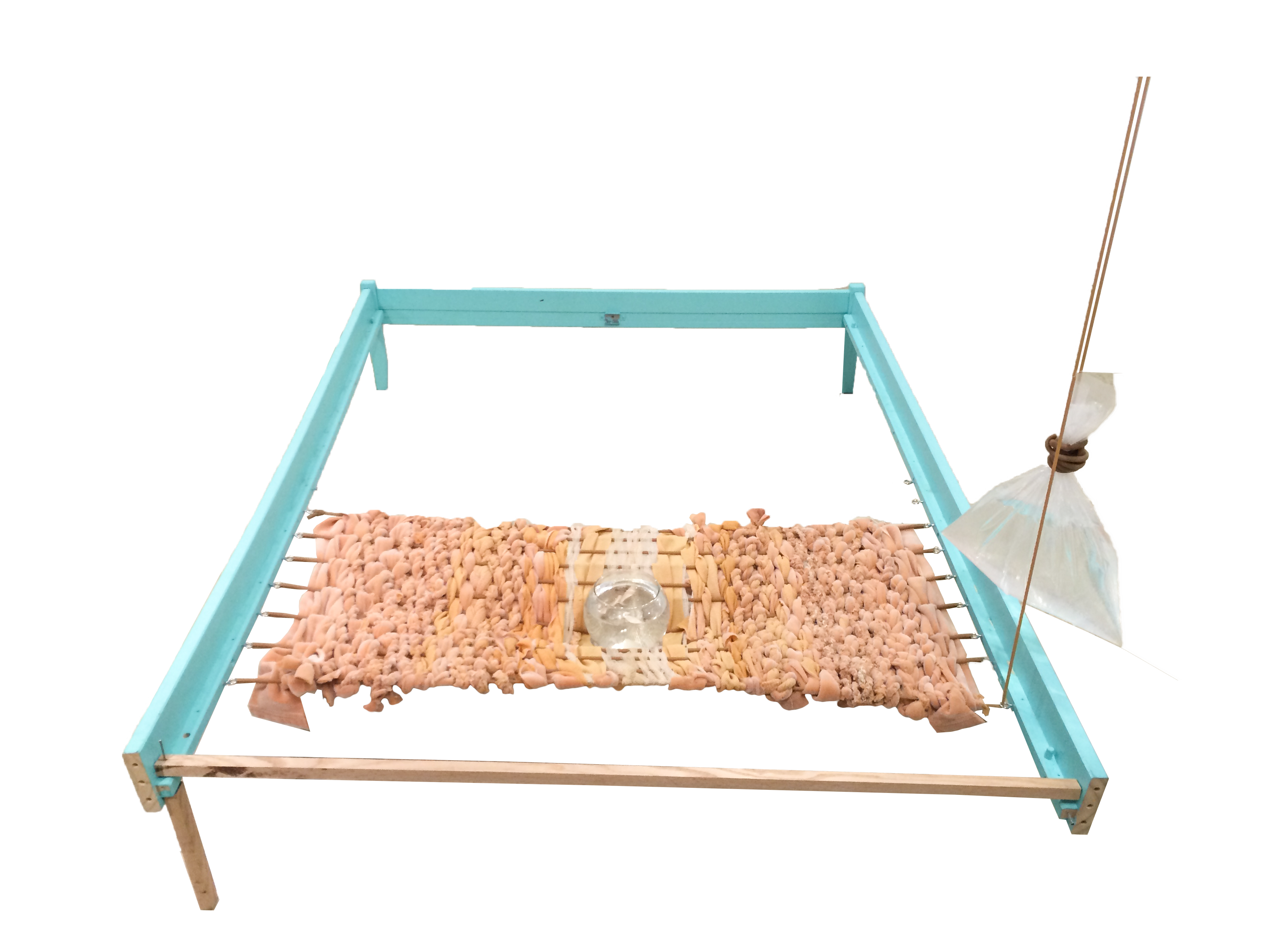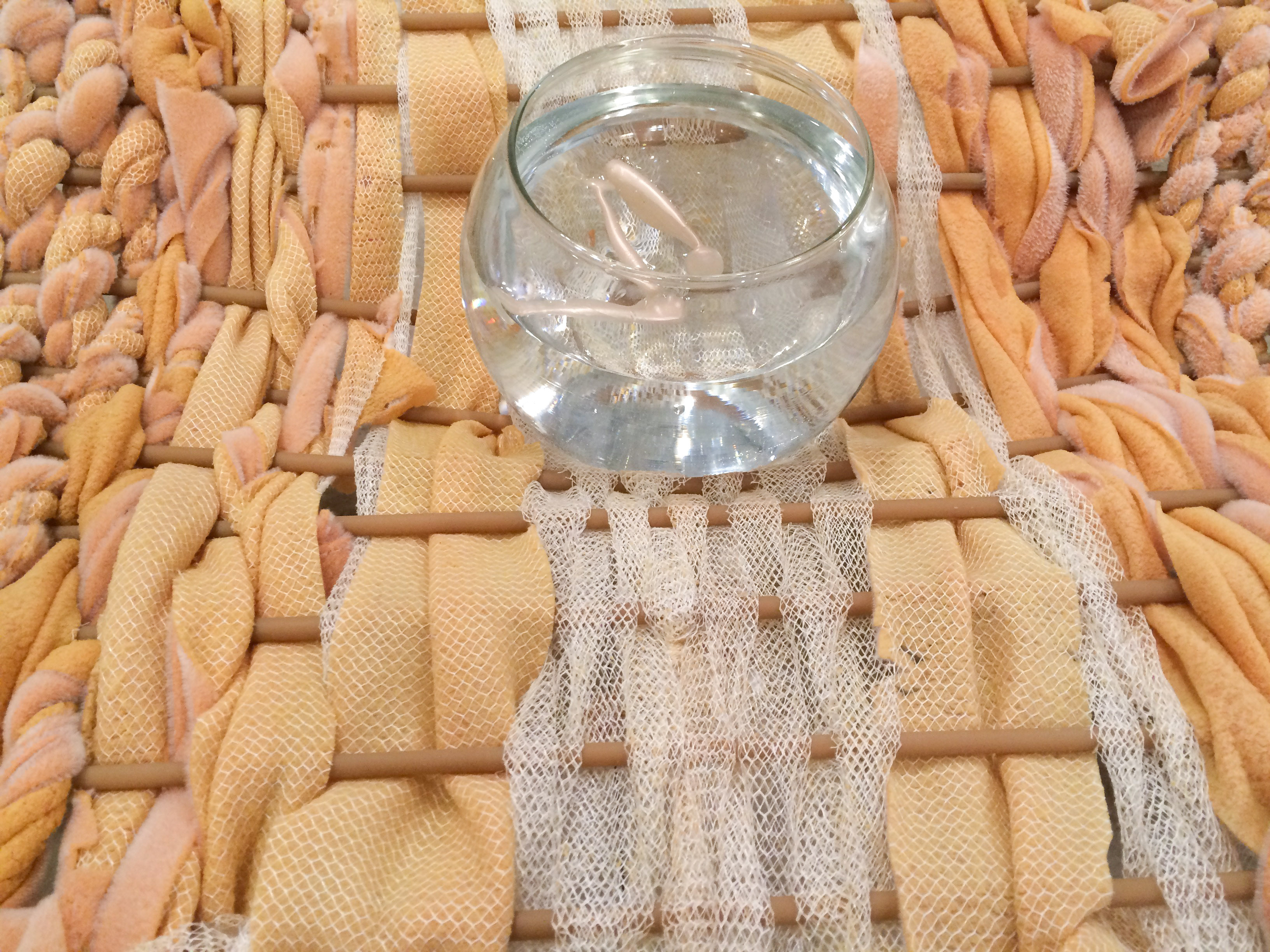 motel thermal blanket, latex tubing, plastic bag,clothes line, fish bowl, “sassy shad” lures